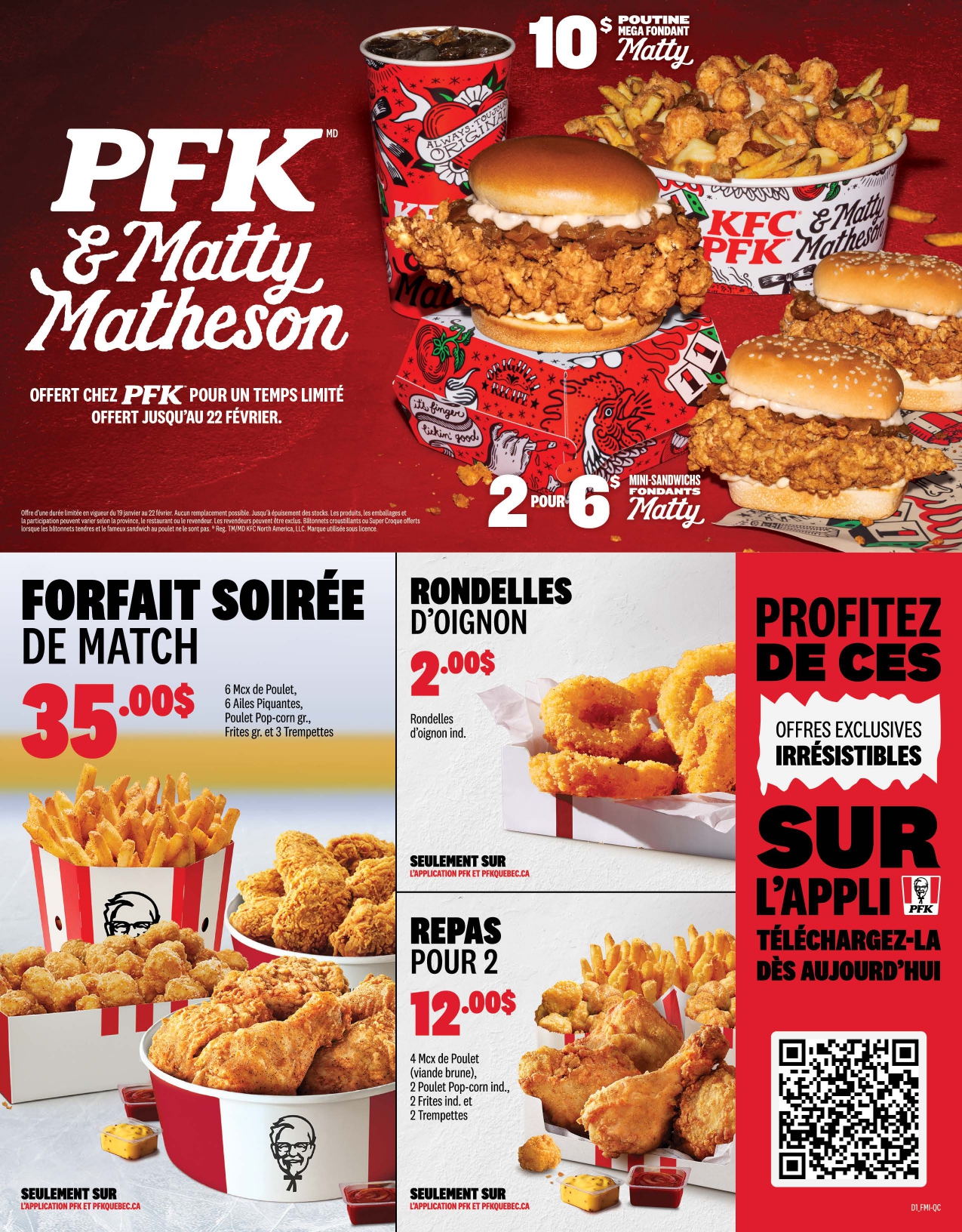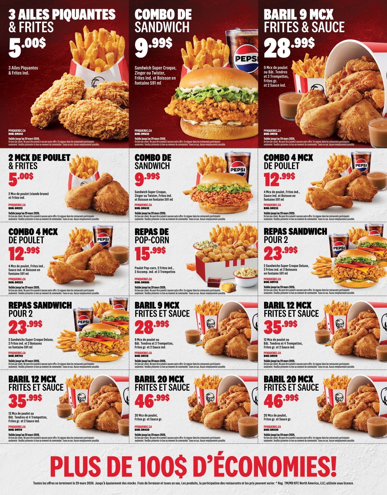 Feuilletez en ligne les coupon PFK Québec 2025 et les spéciaux, valides avant le 29 mars 2026. Trouvez le Poulet Frit Kentucky Coupon a Québec, les PFK menu prix et offres exclusives en ligne, les promotions de sandwich au poulet, des coupons rabais et des informations nutritionnelles et des calories.Poulet Frit Kentucky est une chaîne de restaurants de restauration rapide spécialisée dans le poulet frit. Le produit bien connu de PFK est les morceaux de poulet frit, assaisonnés de la recette de 11 herbes et épices du colonel Harland Sanders.